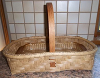 Very large and sturdy basket due to heavy laced runners running along the bottom of the basket. Different colors available for the accent or make it natural. Double hand carved oak swing handles make the basket easy to carry in from the garden. This would also make a great picnic basket due to the double handles for stability.