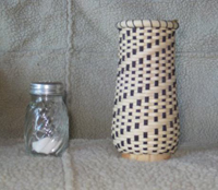This beautiful vase is taught with the permission of its creator, Susan Coyle. A lovely twill pattern spirals up the sides to form a functional vase around a glass container. Fun to weave, beautiful to use.