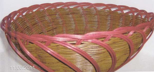 This is an oval bowl/basket made of round reed. It has a square plaited base, twined sides, a top trac border, with a woven bottom border. |