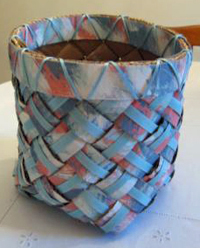 Made almost entirely of recycled materials, this basket is woven of hand-painted cardboard, decorated with colorful shipping tape or nylon cord. Weavers may choose from sets of cardboard strips painted in bright, adventurous colors.
