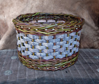 Weave 2/2 twill base with color and natural reeds, stop and start the inside wall with color. Chase weave the outer wall with 2 pieces of #0 seagrass. Incorprate a piece of #6 round reed to the rimming and lashing process. Lash with artificial sinew. Created by Anne Bowers - modified by Roxanne Miller |