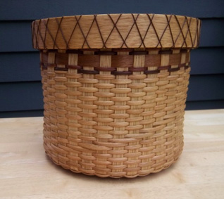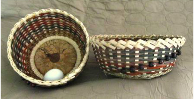 A functional/decorative basket that is woven with a wooden base in chase weave and finished with a pie cruse rim. The base is about 5" with a rim of 9" and the finished basket measuring 5"x9"x4" This basket is appropriate for every skill level. Skills used in this basket are: twining with RR and Seagrass, chase weave, shaping of the basket, lashing, and adding accents. It will take about 3-4 hours. the wooden bead accents are added while you weave. Created by Della Pleski |