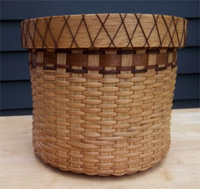 This basket is a study in shaping. Starting with an 8" wooden base and weaving to a 10" x 1-1/4" ring for the outer rim drives the shape of the basket. Finish with a fancy lashing. This is a very sturdy basket. Created by Jill Scarpari |