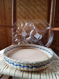 This versatile basket is fun to weave and useful to own. Woven on a large wooden base, the class includes 2 inserts, one for appetizers and one for eggs. There will be color choices and it is topped with an intricate (but easy) lashing technique. | 13" x 2.5" |