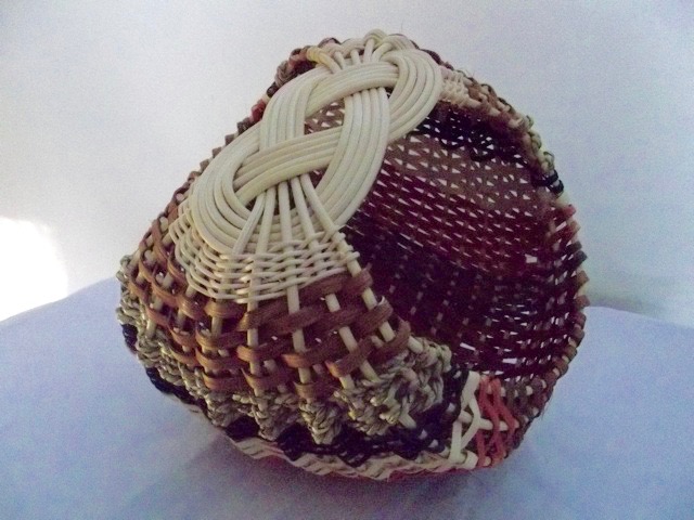 This unique ribbed style basket starts with a beautiful Josephine knot using #6 round reed the round reed. This knot forms the handle of the basket. Students will use a variety of weaving materials to create a beautiful ribbed basket. Round reed, mini sea grass, ¼”, 11/64” and 3/16” flat and flat oval reed. Each basket will be unique and different. A fun class. | 10" x 7" |